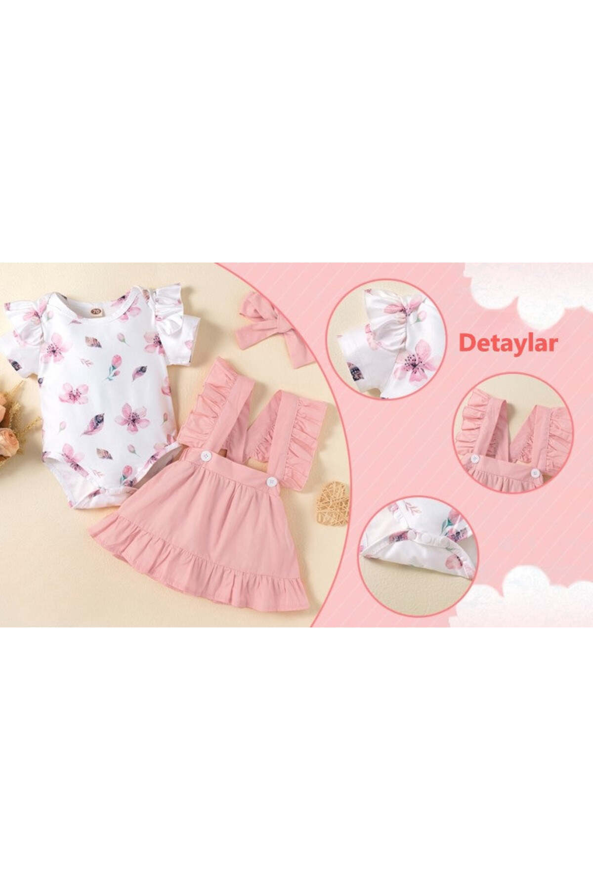 بادی نوزادی دخترانه، بادی، دامن گلدار، ست لباس بادی آستین کوتاه طرح: رامپر شیک نوزادی با شانههای چیندار و طرح گلهای صورتی، کودک شما را جذابتر میکند.