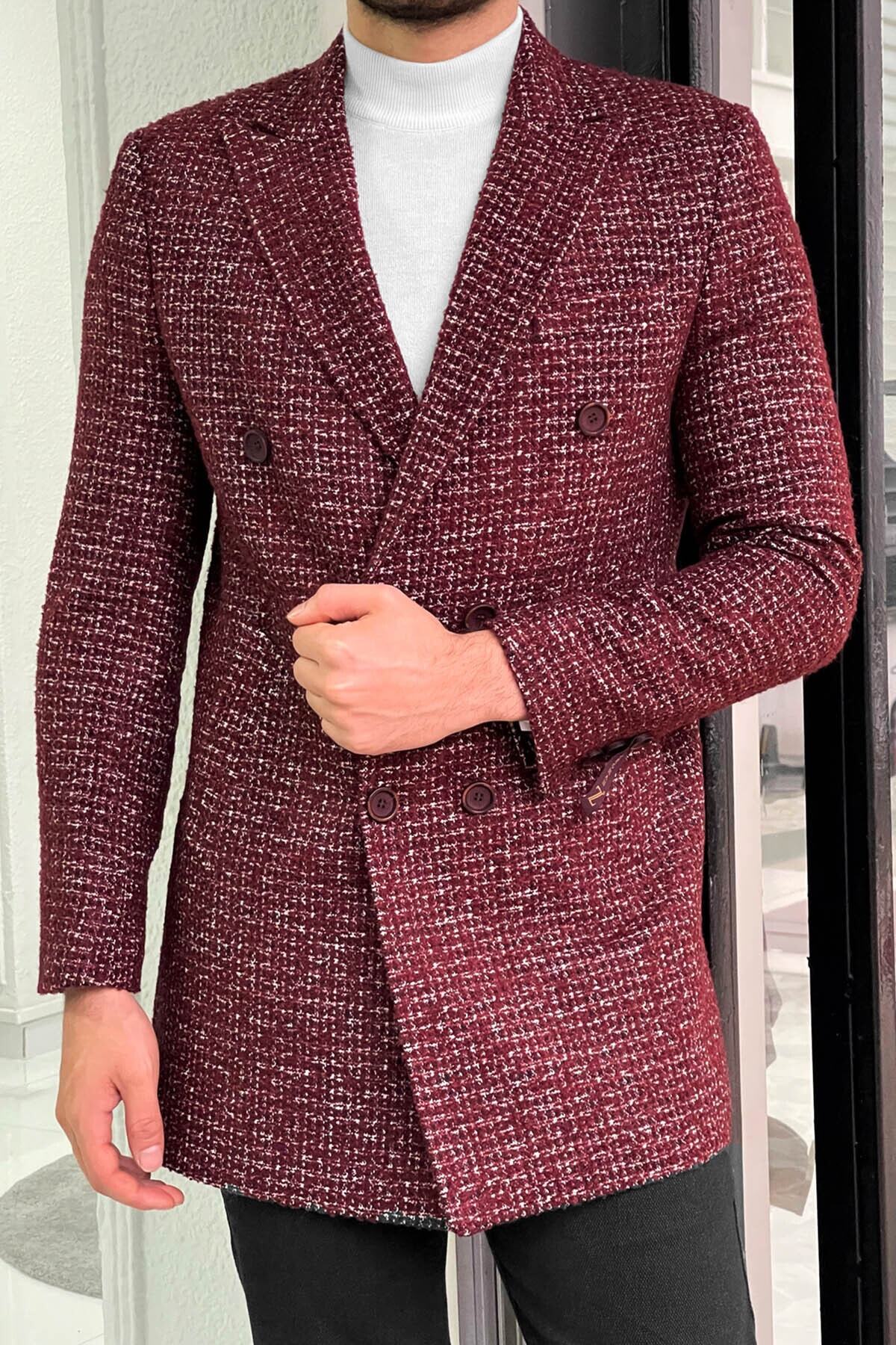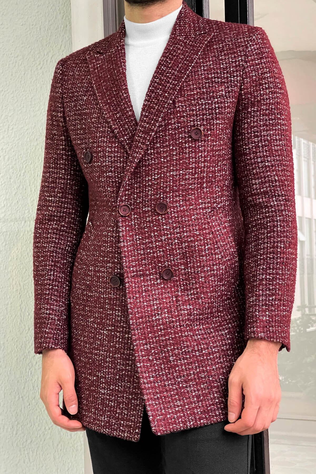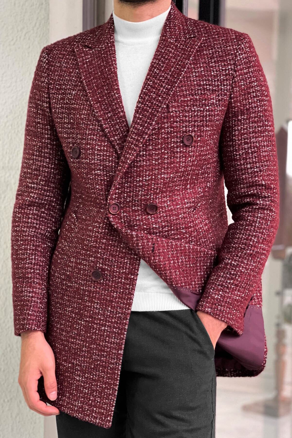 خرید اینترنتی کاپشن پشمی طرحدار دو دکمهای باریک به رنگ زرشکی برند NAZEF اورجینال از Nazefofficial نمایندگی ترکیه