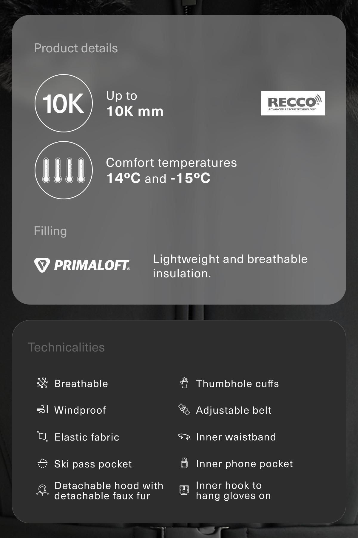 پارچه بازتابنده RECCO® به امدادگران مجهز به ردیاب‌ها اجازه می‌دهد تا در صورت وقوع حادثه بهمن یا گم شدن در یک منطقه دورافتاده، شما را پیدا کنند.