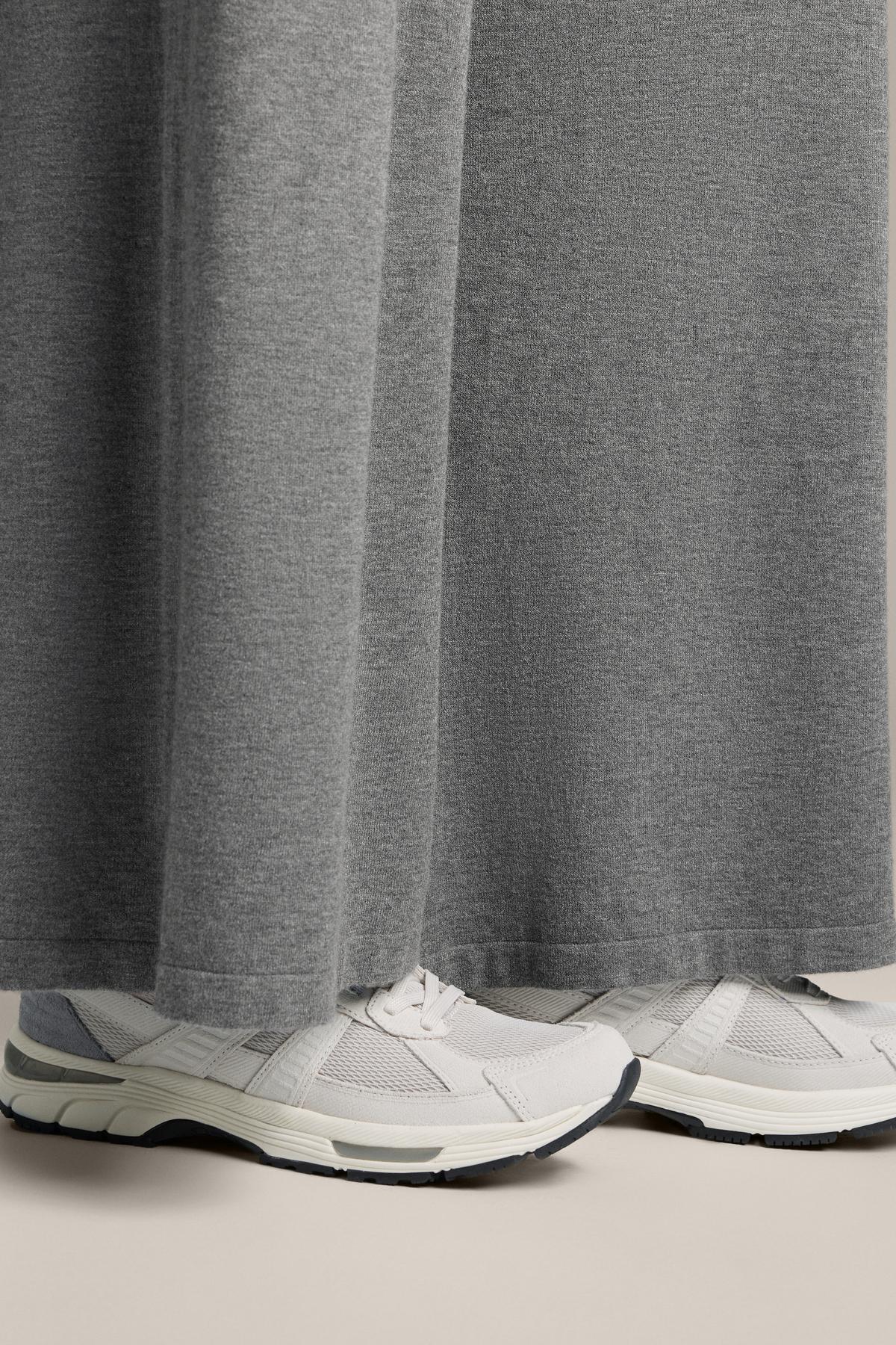شلوار گشاد، راسته و بافتنی با کمر کشی قابل تنظیم.