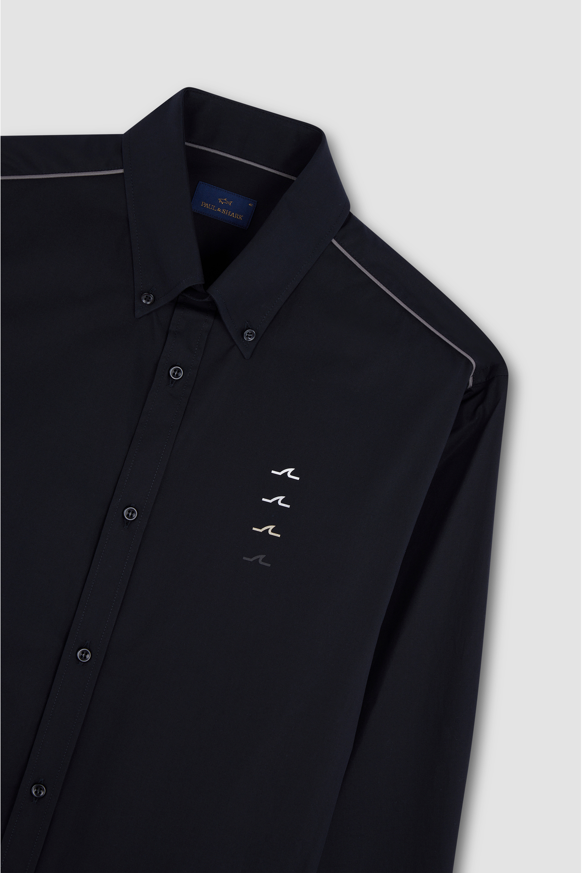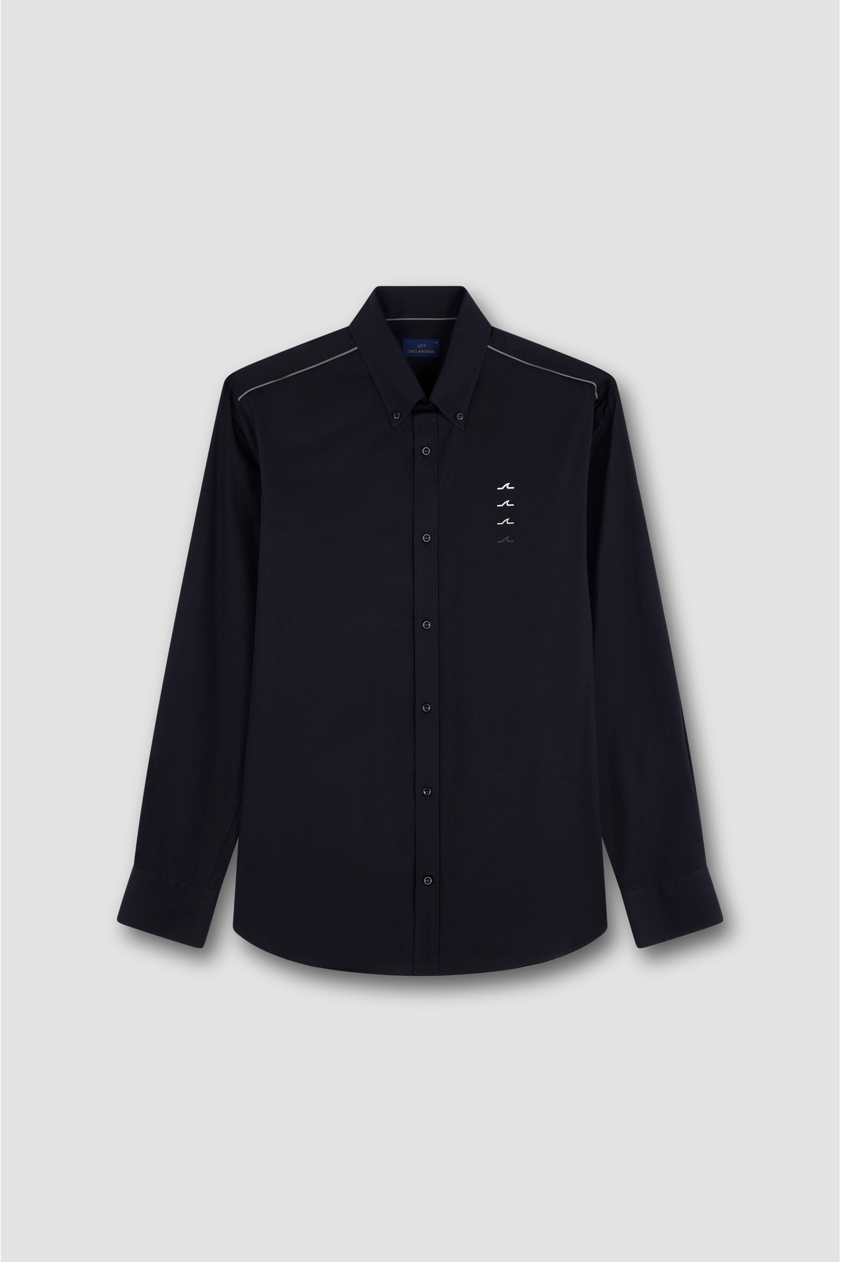 خرید اینترنتی پیراهن مردانه مشکی آستین بلند با جزئیات راه راه روی شانه، ۱۰۰٪ پنبه، فیت معمولی، و طرح فین روی سینه. برند پال اند شارک Paul&Shark اورجینال از Wejaar نمایندگی ترکیه
