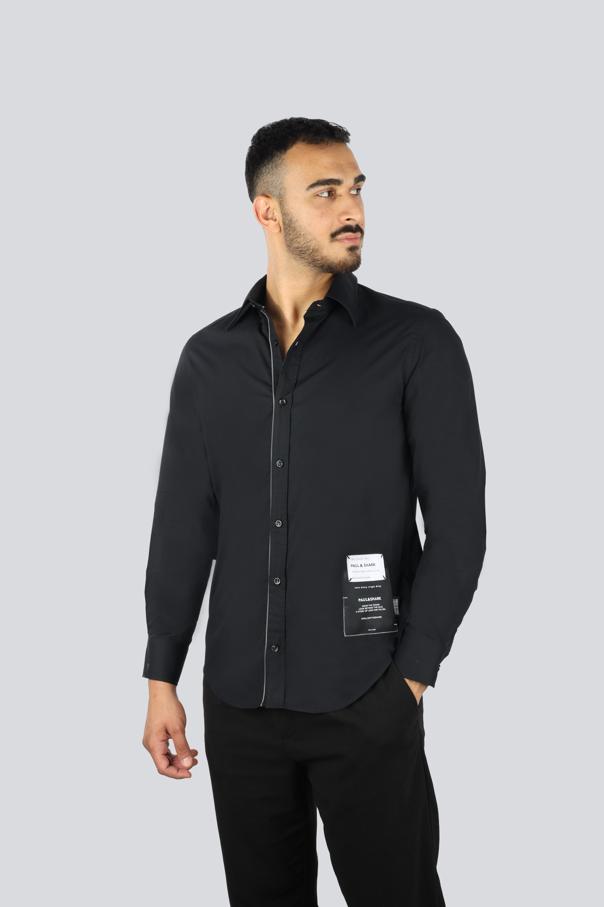 خرید اینترنتی پیراهن مردانه آستین بلند طرحدار نخی مشکی با چاپ لوگو، سایز معمولی، کد ۲۵۴۱۳۵۲۷-۰۱۱ برند پال اند شارک Paul&Shark اورجینال از Wejaar نمایندگی ترکیه