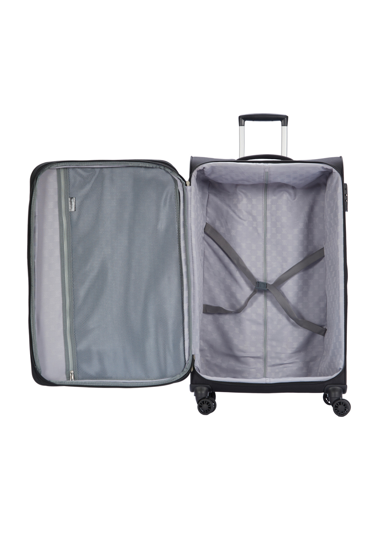 چهار چرخ دوتایی چرخان 360 درجه که از مواد لاستیکی-سیلیکونی ساخته شده اند که وزن را متعادل کرده و حمل آن را آسان می کند. پارچه فوق سبک. دسته قابل تنظیم تلسکوپی. سیستم قفل ترکیبی قابل تنظیم TSA. دسته حمل. تسمه های چمدان در دو محفظه که توسط یک جیب مشبک از هم جدا شده اند. ساختار بدنه سبک تر آن باعث می شود که نسبت به همتایان خود از لحاظ ظرفیت چمدان مناسب تر باشد.