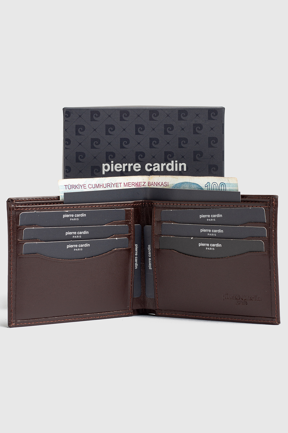 ست 8 تایی کیف پول کمربند دامادی 100% چرم طبیعی، همراه با جعبه کادویی ویژه، قهوهای آنالین مردانه پیرکاردین راسته | Pierre Cardin 25EP000032