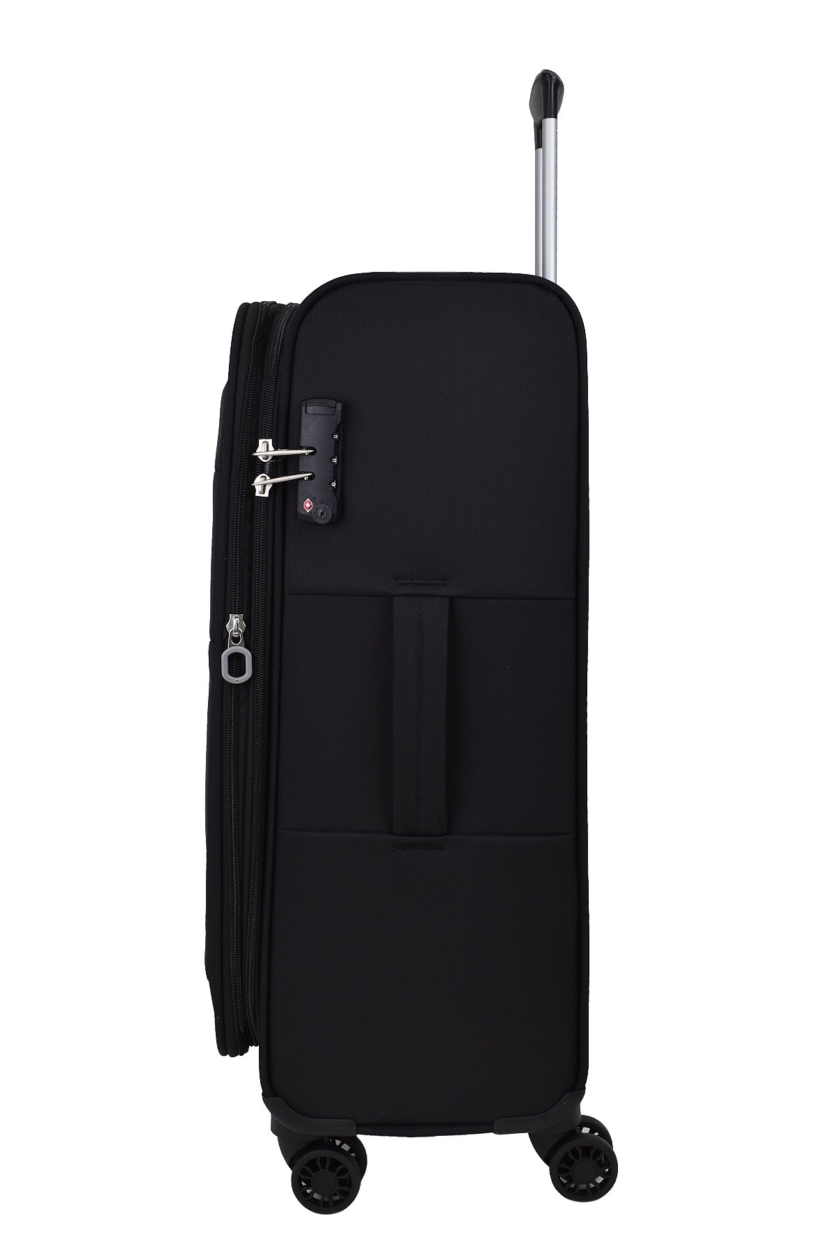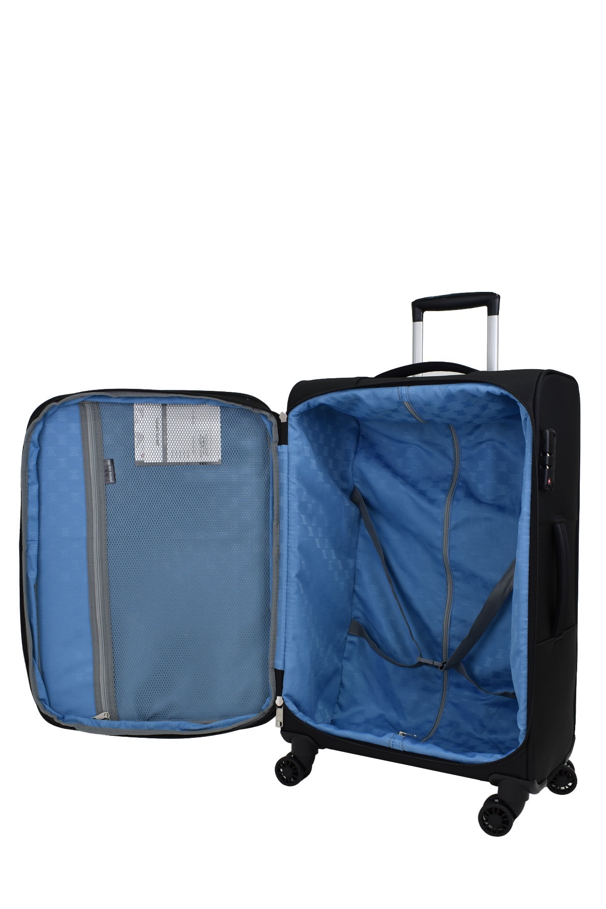 چهار چرخ دوتایی با قابلیت چرخش ۳۶۰ درجه از جنس لاستیک-سیلیکون که وزن را متعادل کرده و حمل را آسانتر میکنند. دسته تلسکوپی قابل تنظیم. سیستم قفل ترکیبی قابل تنظیم TSA. دسته حمل. دو محفظه که توسط یک جیب توری با بندهای چمدانی در داخل از هم جدا شدهاند. پارچه با کیفیت بالا. ساختار بدنه سبکتر در مقایسه با نمونههای مشابه، آن را برای حمل بار مناسب میکند.