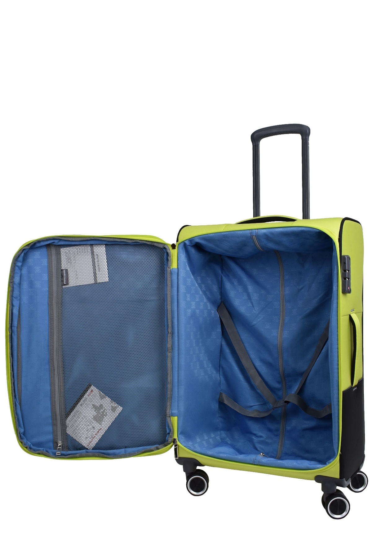 چهار چرخ دوتایی با قابلیت چرخش ۳۶۰ درجه از جنس لاستیک-سیلیکون که وزن را متعادل کرده و حمل را آسانتر میکنند. دسته تلسکوپی قابل تنظیم. سیستم قفل ترکیبی قابل تنظیم TSA. دسته حمل. دو محفظه که توسط یک جیب توری با بندهای چمدانی در داخل از هم جدا شدهاند. پارچه با کیفیت بالا. ساختار بدنه سبکتر در مقایسه با نمونههای مشابه، آن را برای حمل بار مجاز میکند.
