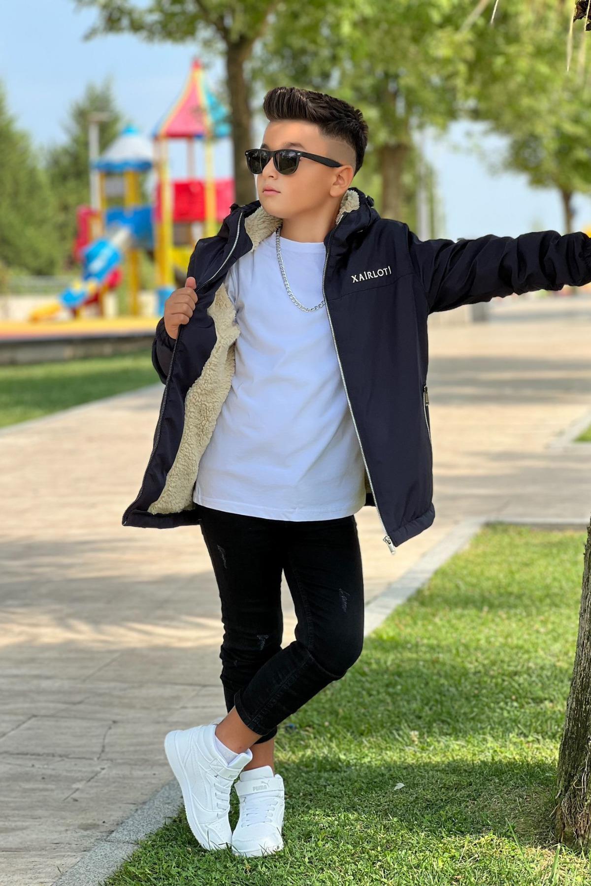 کاپشن خزدار کلاهدار ثابت پسرانه با آرم فلزی KM3987 پسرانه پینا کیدز آستین استاندارد راسته | Pina Kids KM3987