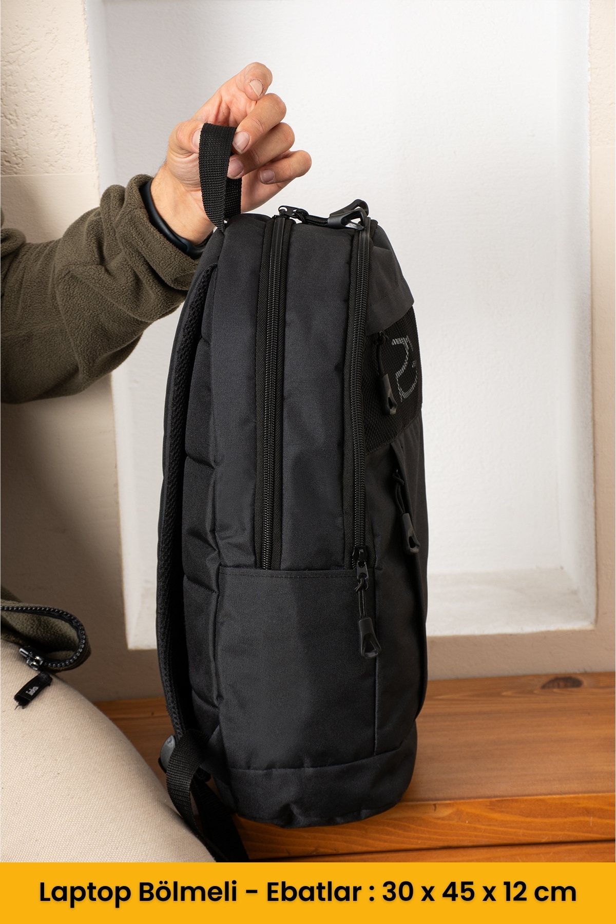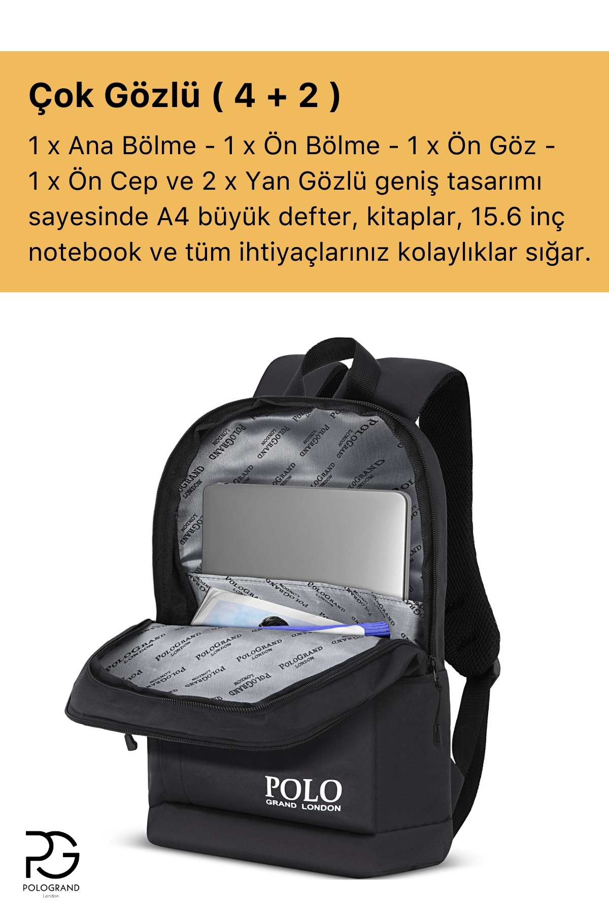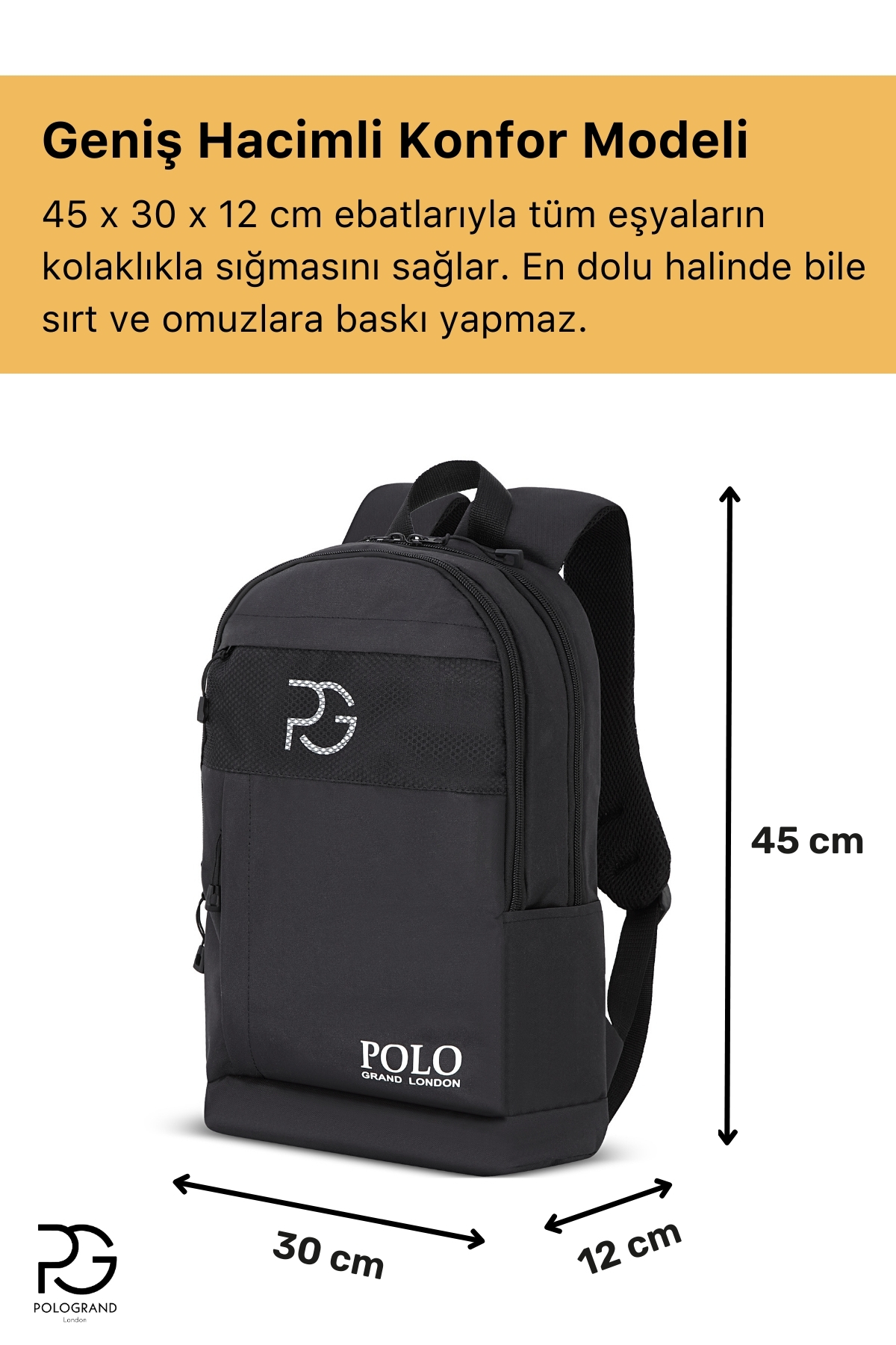 کوله پشتی مشکی چند قسمتی، ظرفیت بالا، مدرسه، ورزش، دوره، دانشگاه، مسافرت، محفظه لپ تاپ، کوله پشتی مشکی روزمره زنانه راسته | POLOGRAND London Polo Backpack İçin Geniş Model Şık PG52