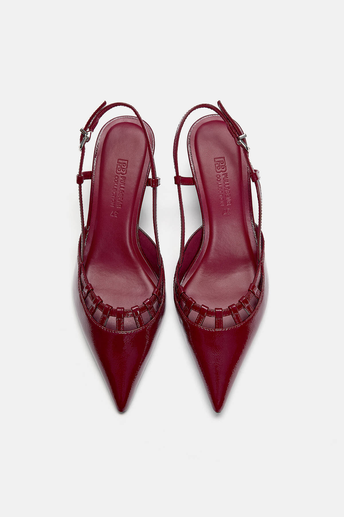 کفش های پاشنه بلند پارچه ای با ظاهر چرمی که در رنگ قرمز موجود است. جزئیات باند در جلو. پاشنه بلند و نازک. انگشت نوک پا. بسته شدن سگک. کفی STARFIT®. ارتفاع پاشنه: 5 سانتی متر. 100% پلی اورتان. خشکشویی نکنید. چرم: رنگ ثابت.