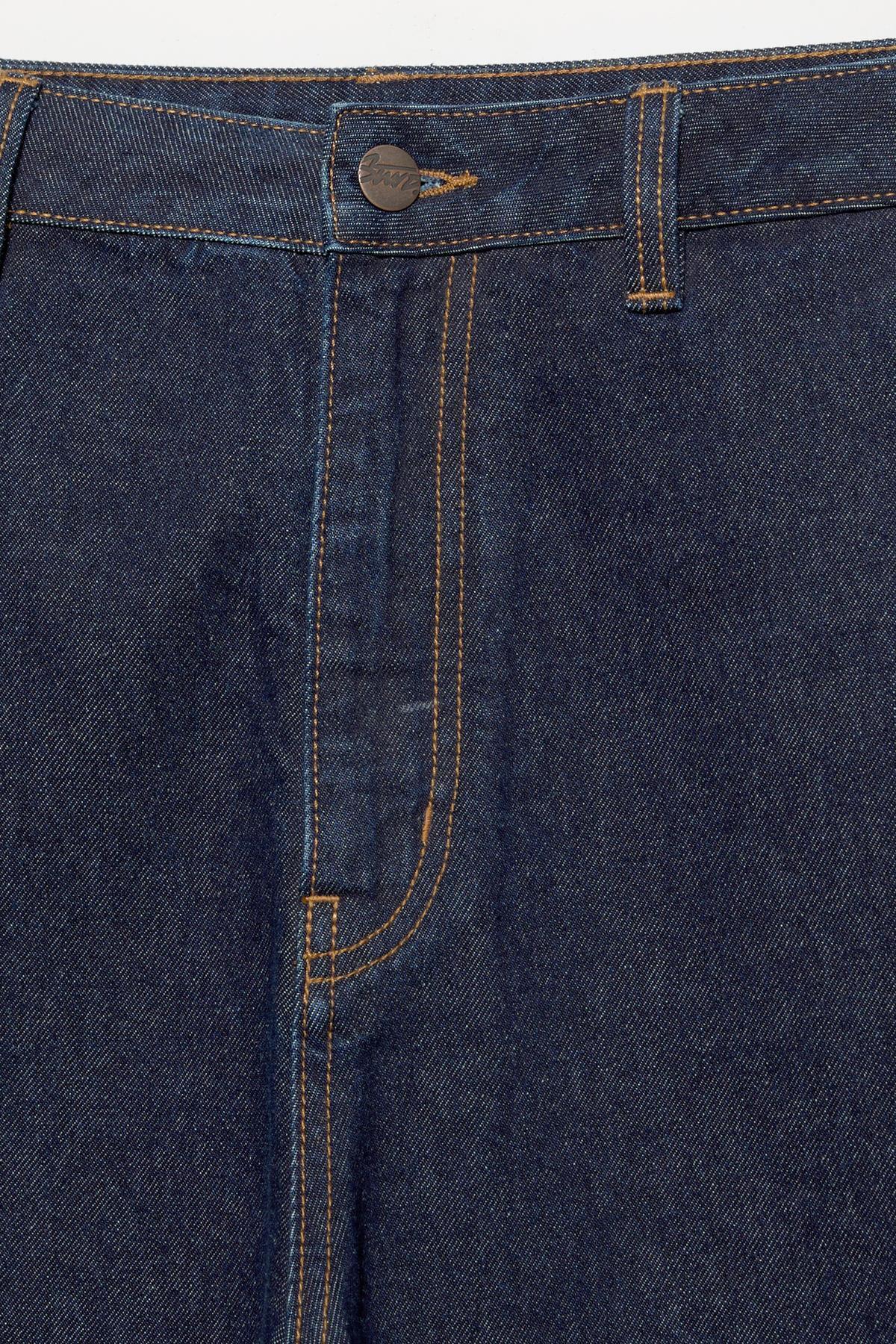 شلوار جین گشاد از جنس ۱۰۰٪ پنبه، طرح ژاکارد، پنج جیب، حلقه کمربند، زیپ و دکمه.