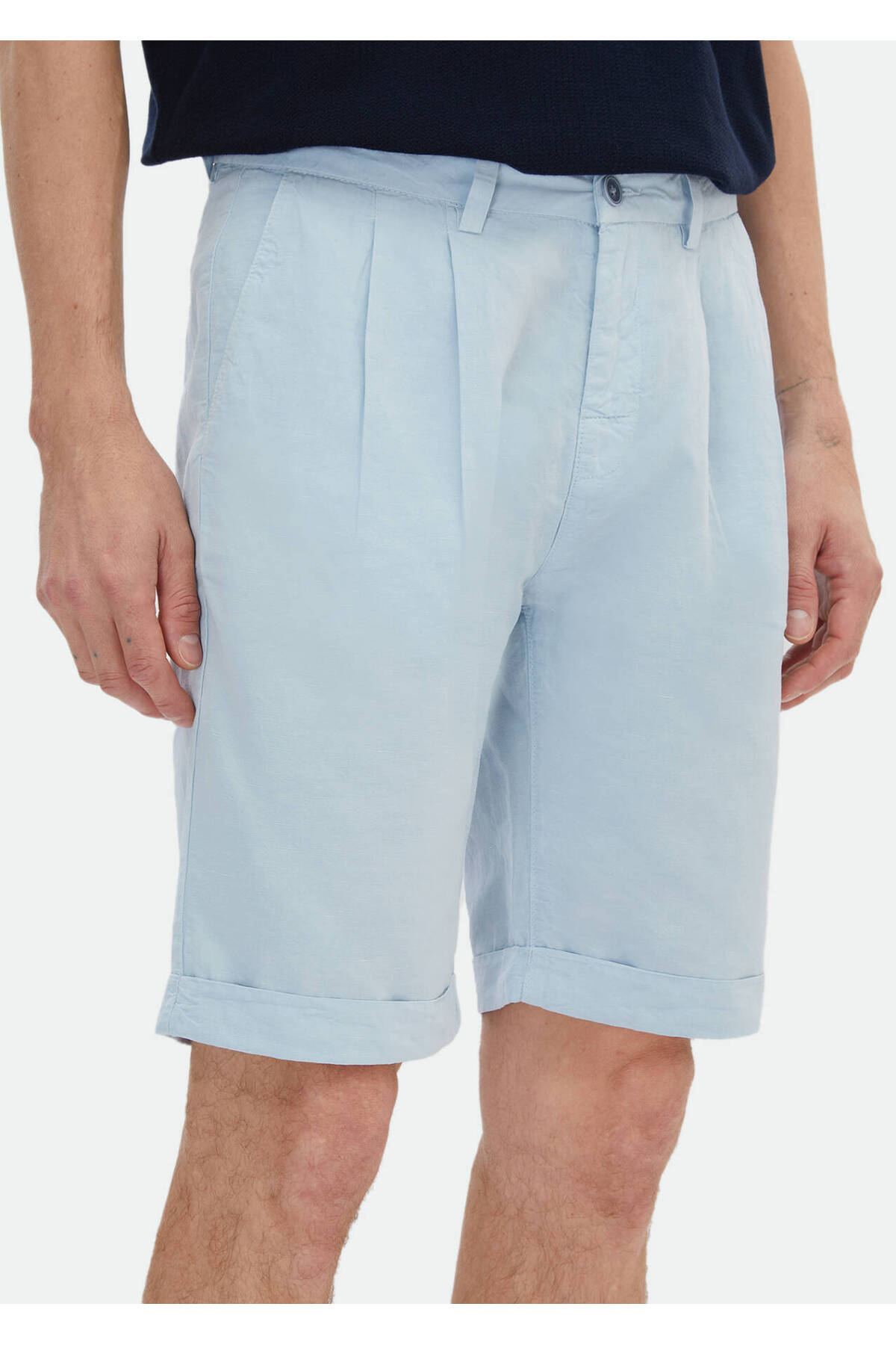 – شورت برمودا با بافت ساده آبی روشن با دور کمر منظم، ایده آل برای ظاهری راحت و شیک.
