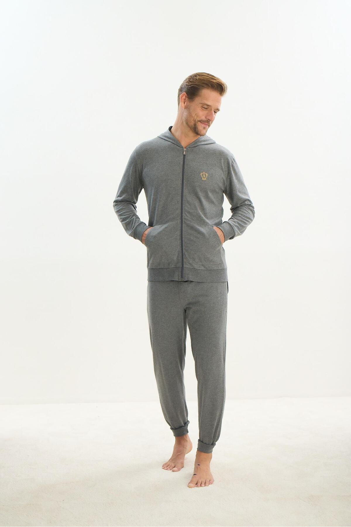 خرید اینترنتی ست لباس خواب مردانه آستین بلند کلاه دار زیپ دار از جنس آنتراسیت مدل C4T4N5O9 برند سویم Sevim اورجینال از cotonhause نمایندگی ترکیه