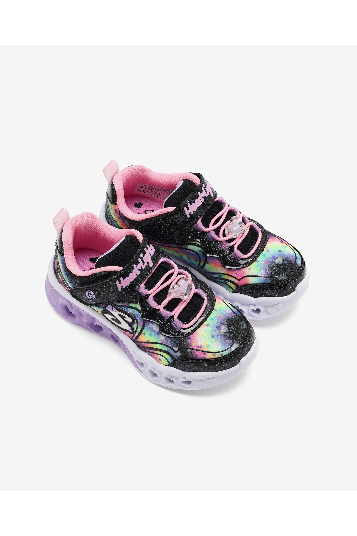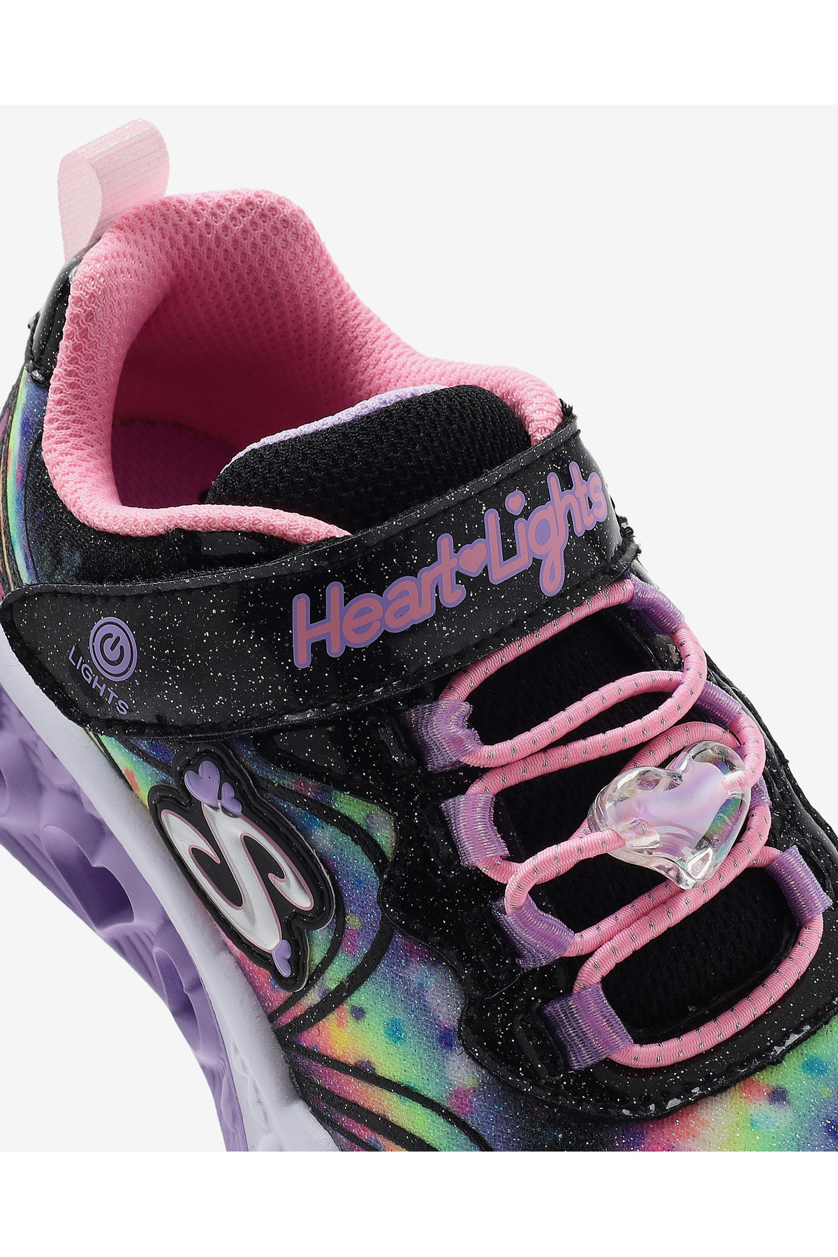 این کفش دخترانه چراغدار دارای رویه پارچهای طرح اکلیلی چند رنگ با روکشهای اکلیلی مصنوعی، بندهای کشی با جزئیات قلب و بند بالایی قابل تنظیم است.