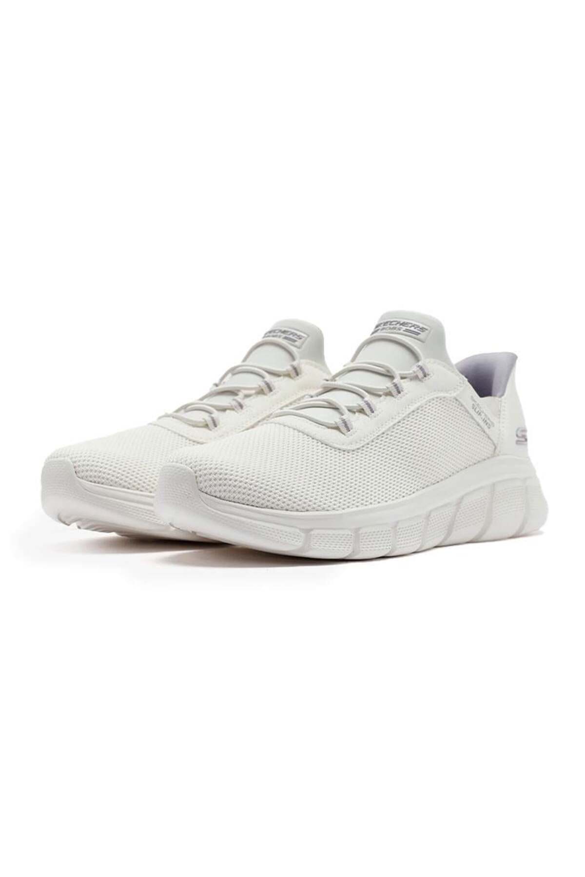 کفش راحتی زنانه Skechers BOBS B Flex به رنگ سفید (117502-OFWT) یک کفش راحتی زنانه است که با طراحی مینیمالیستی، ساختار فوق سبک و تولید پایدار خود متمایز میشود.