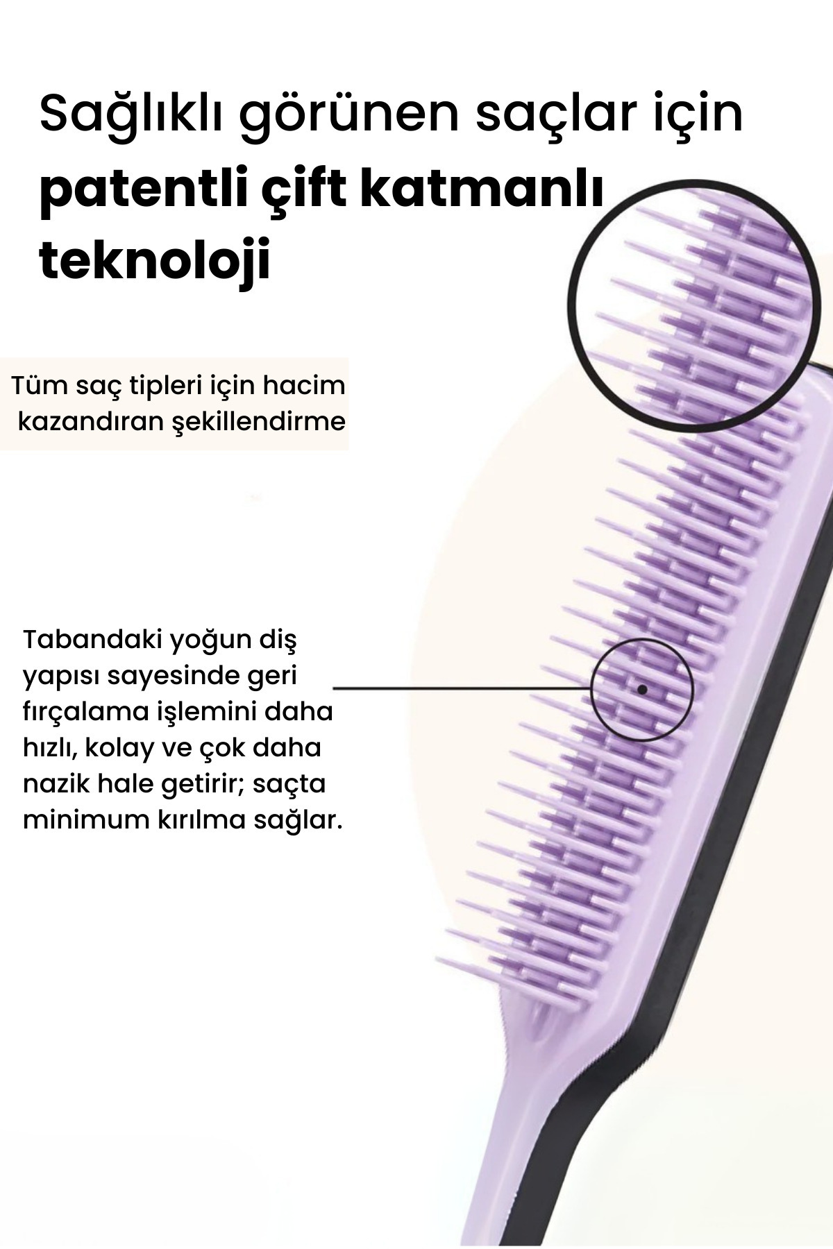 این برس با فناوری منحصر به فرد دو مرحله‌ای، برس زدن را سریع‌تر، آسان‌تر و ملایم‌تر می‌کند و ساختار موهای متراکم‌تری در ریشه‌ها دارد.
