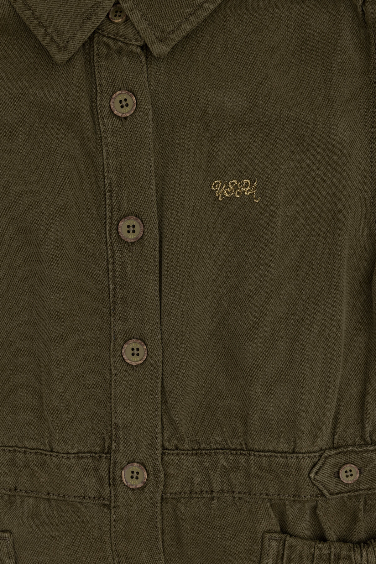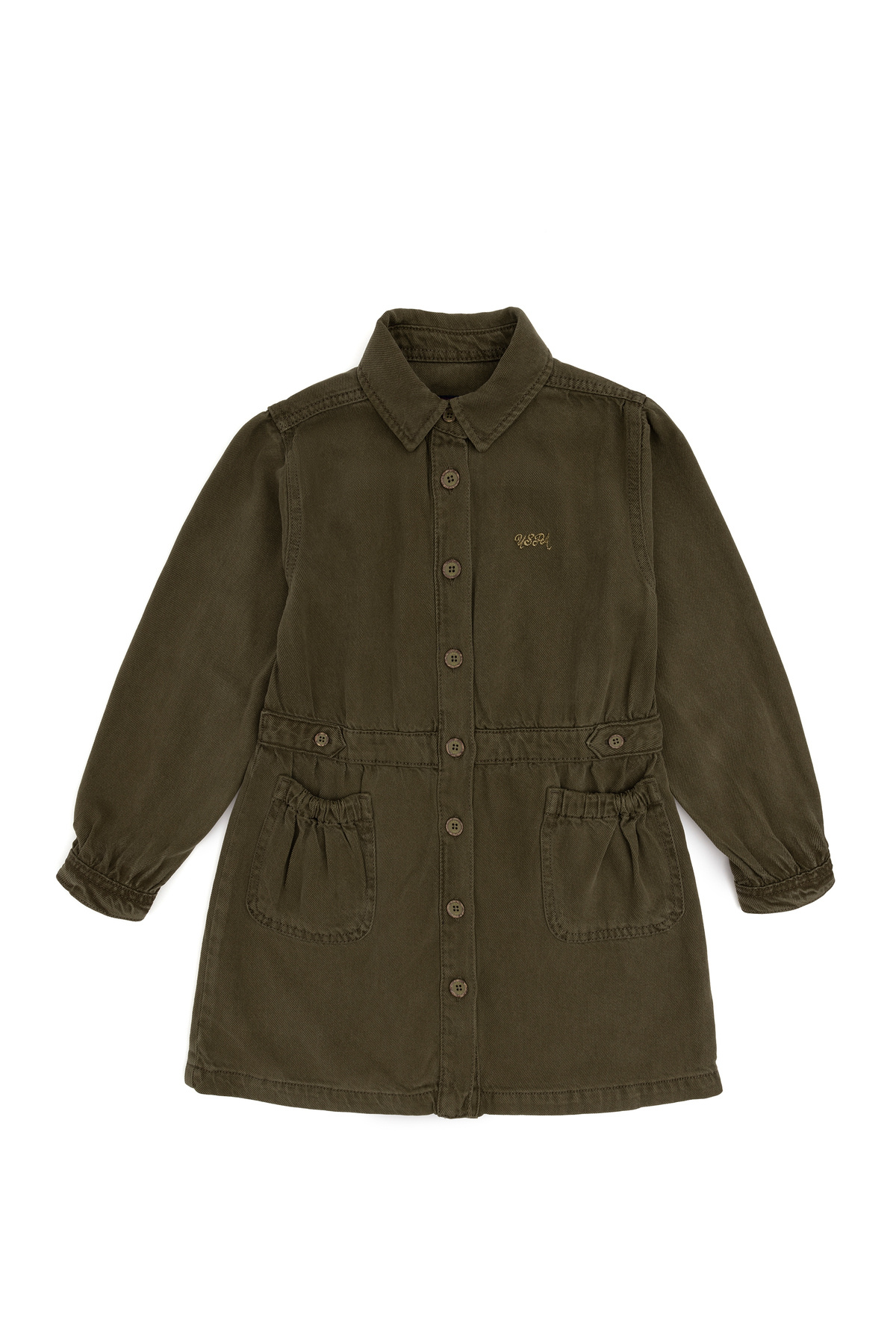 – یک لباس جین خاکی رنگ که مخصوص کودکان طراحی شده و ظاهری راحت و شیک ارائه میدهد.