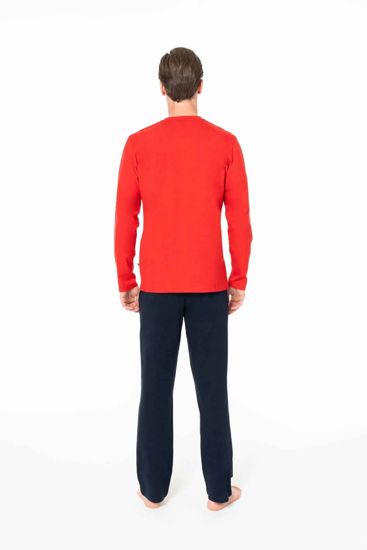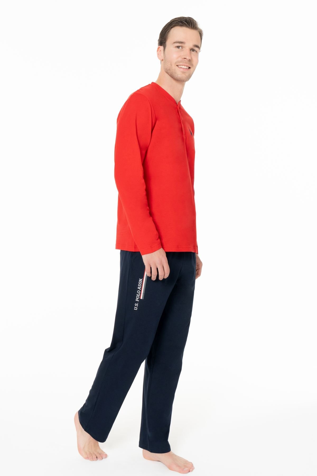 ست لباس خواب مردانه یقه سه دکمه آستین بلند U.S. Polo Assn. 18959. این ست از پارچه مرغوب ساخته شده و دارای کمر کشی است.