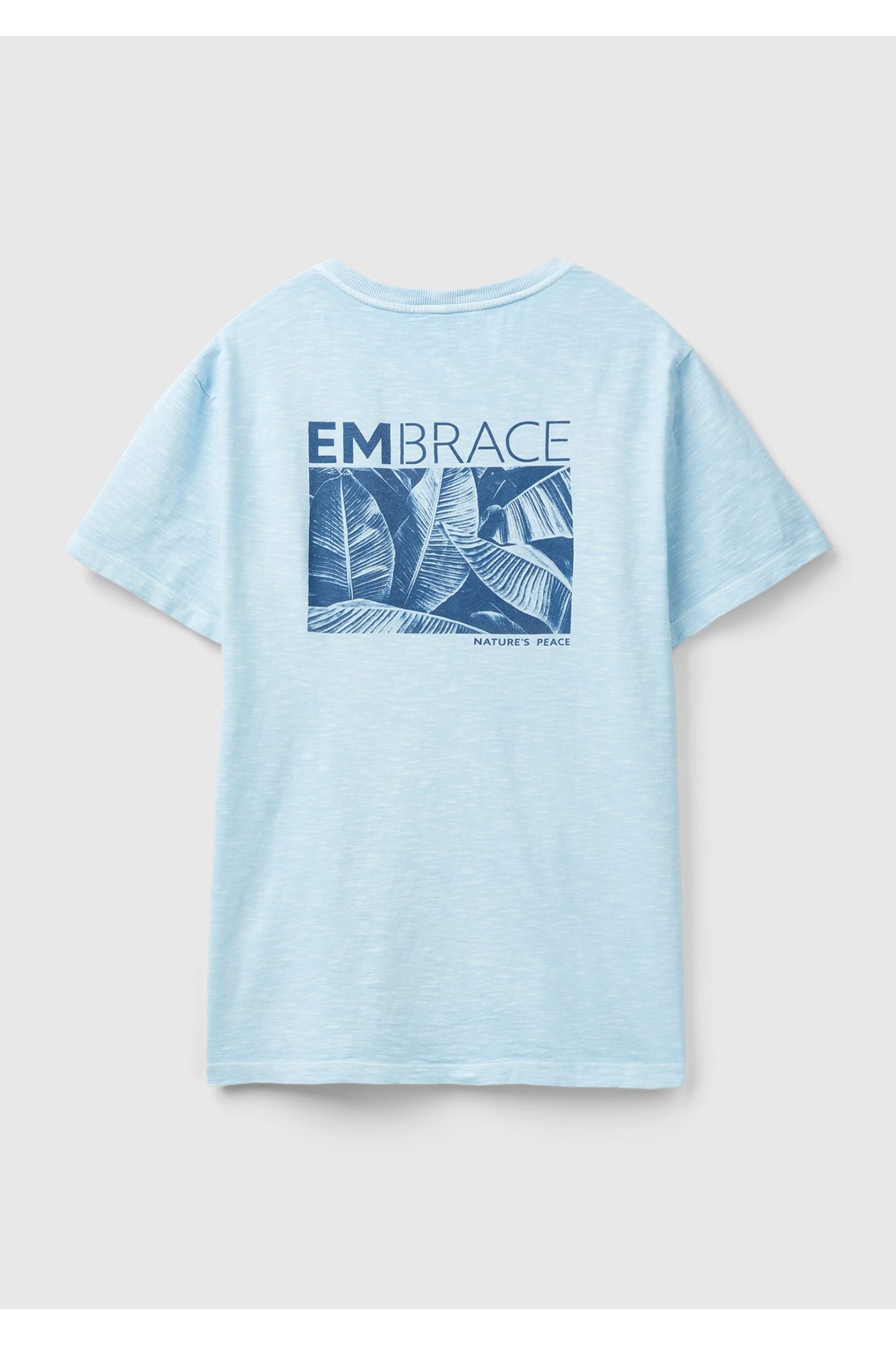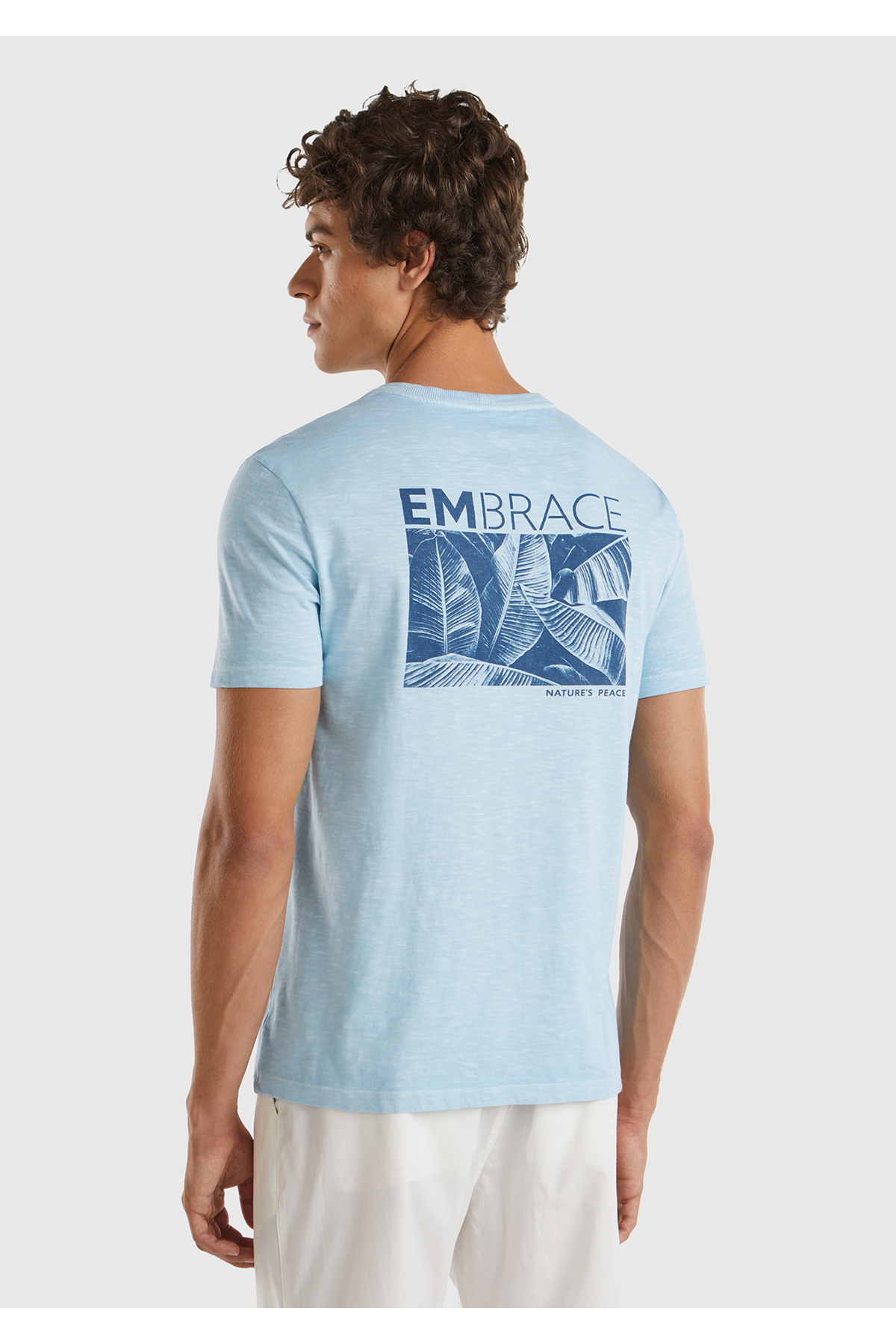 خرید اینترنتی تیشرت یقه گرد مردانه ۱۰۰٪ پنبهای آبی روشن با چاپ گرافیکی در جلو و پشت برند یونایتد کالرز آو بنتون United Colors of Benetton اورجینال از United Colors of Benetton نمایندگی ترکیه