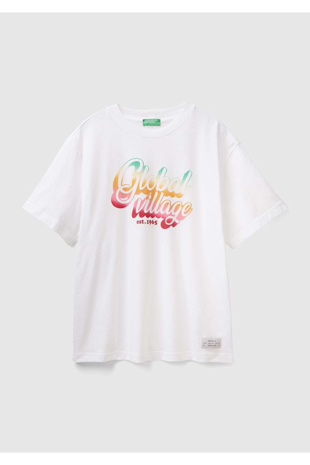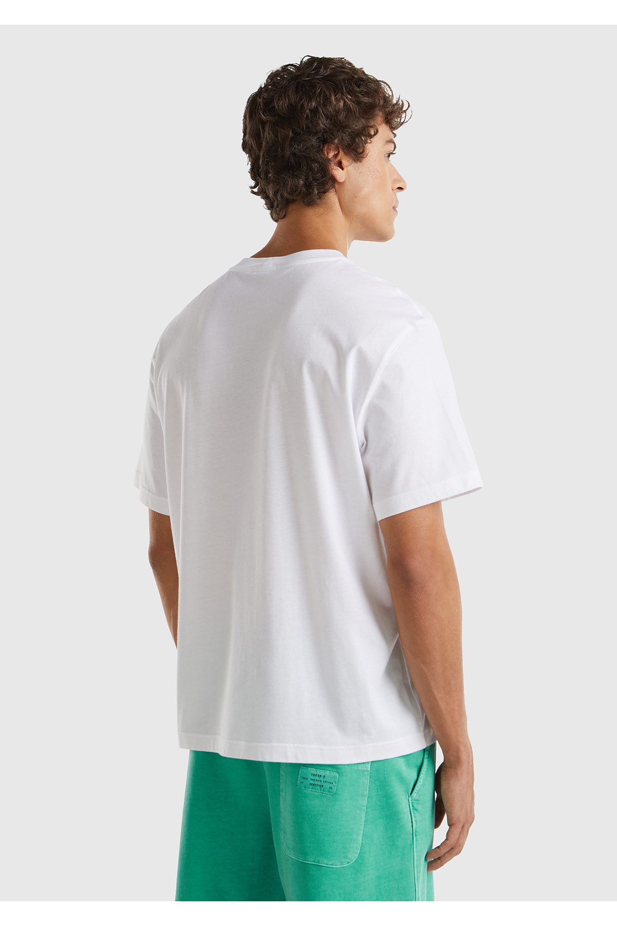 خرید اینترنتی تیشرت یقه گرد مردانه ۱۰۰٪ پنبه سفید با چاپ گرافیکی در جلو و پشت برند یونایتد کالرز آو بنتون United Colors of Benetton اورجینال از United Colors of Benetton نمایندگی ترکیه