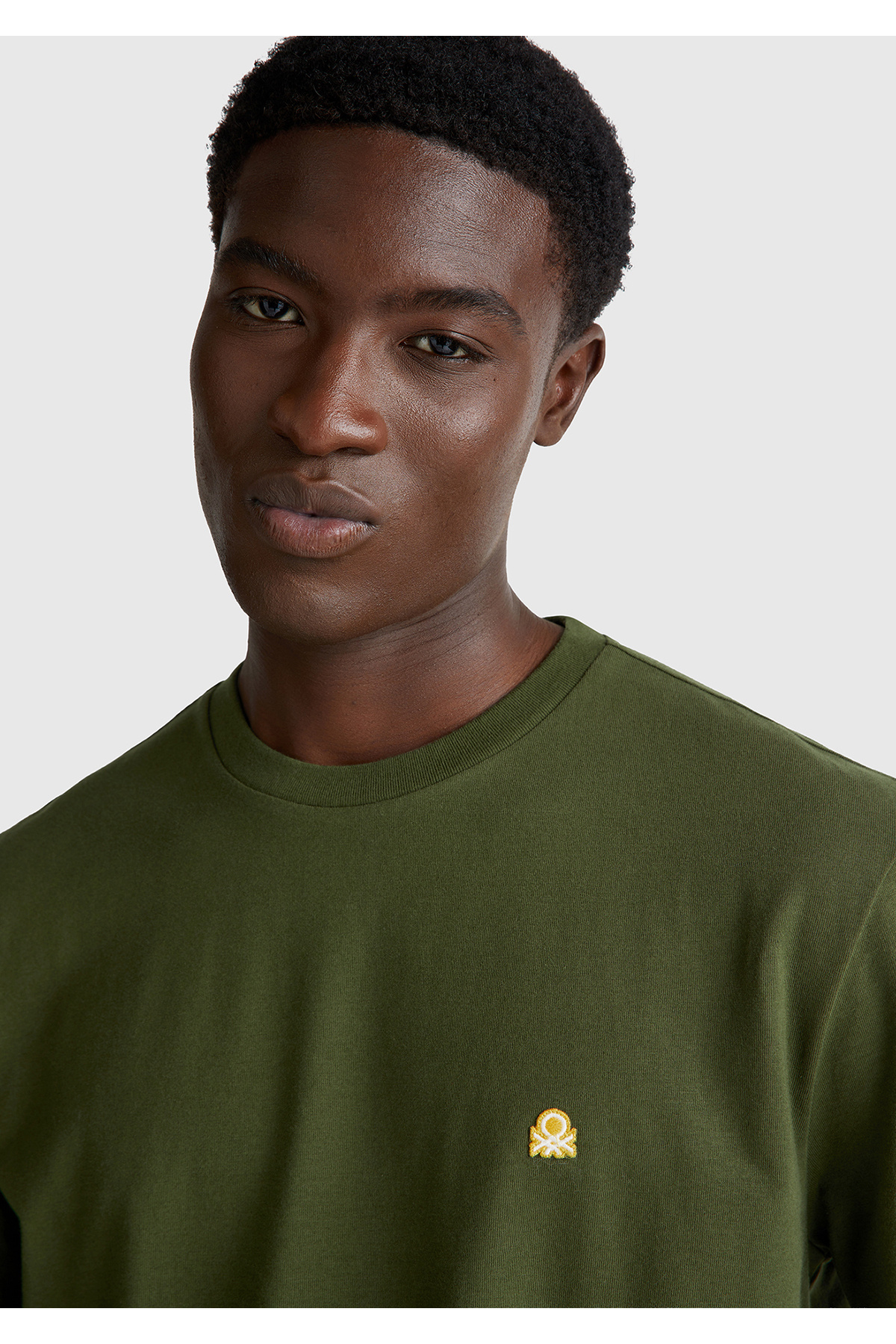 خرید اینترنتی تیشرت یقه گرد مردانه ۱۰۰٪ پنبهای به رنگ سبز تیره با لوگوی بنتون برند یونایتد کالرز آو بنتون United Colors of Benetton اورجینال از United Colors of Benetton نمایندگی ترکیه