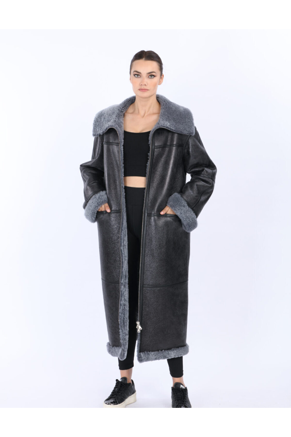 خرید اینترنتی یقه خز خاکستری، کاپشن بلند خزدار دو طرفه زیپدار جیبدار از چرم اصل برند VELLUTON اورجینال از VLT LEATHER & FUR نمایندگی ترکیه