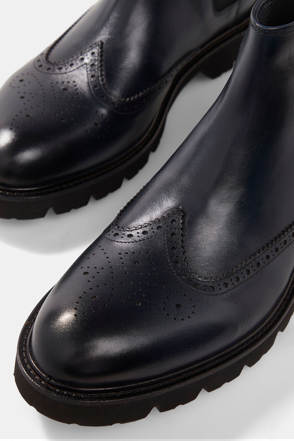 چکمههای آبی تیره از مجموعه W، با بندهای کشی، از چرم ساخته شدهاند.