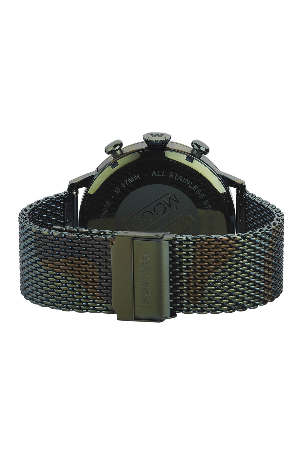 ساعت Welder Moody «Breezy Collection» شما با شیشههای تغییر رنگ «Photochromic»، تاجهای پیچدار سمت چپ، و حالت خنک بند فلزی مشبک، مد روزترین لوازم جانبی برای تکمیل استایل شما خواهد بود! رنگ بند و بدنه Welder Moody مدل WWRC1016 استتار سبز زیتونی است.