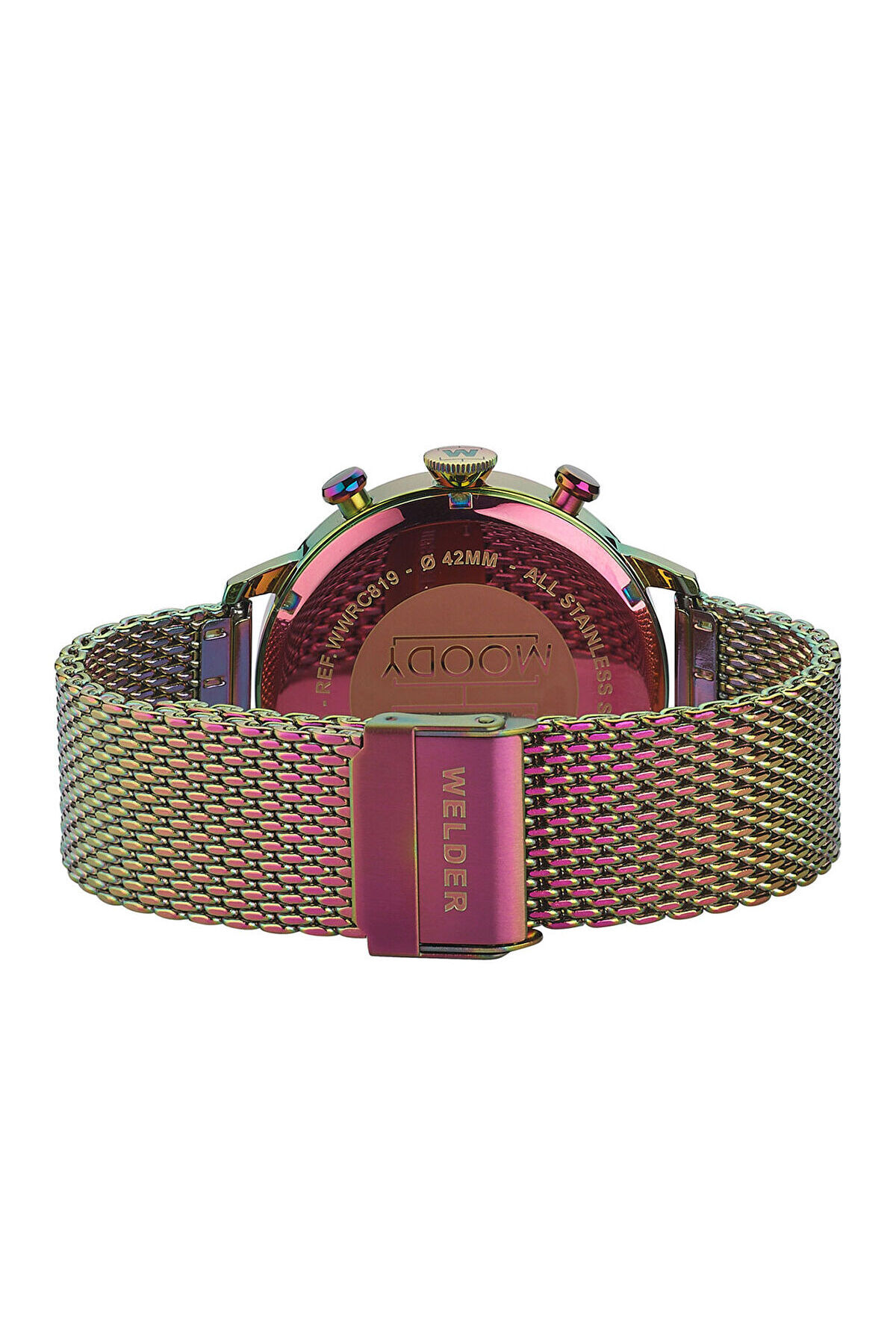 ساعت Welder Moody «Breezy Collection» شما با شیشههای تغییر رنگ «Photochromic»، تاجهای پیچدار سمت چپ، و حالت خنک بند فلزی مشبک، مد روزترین لوازم جانبی برای تکمیل استایل شما خواهد بود! رنگ بند و بدنه Welder Moody مدل WWRC819 نئون است.