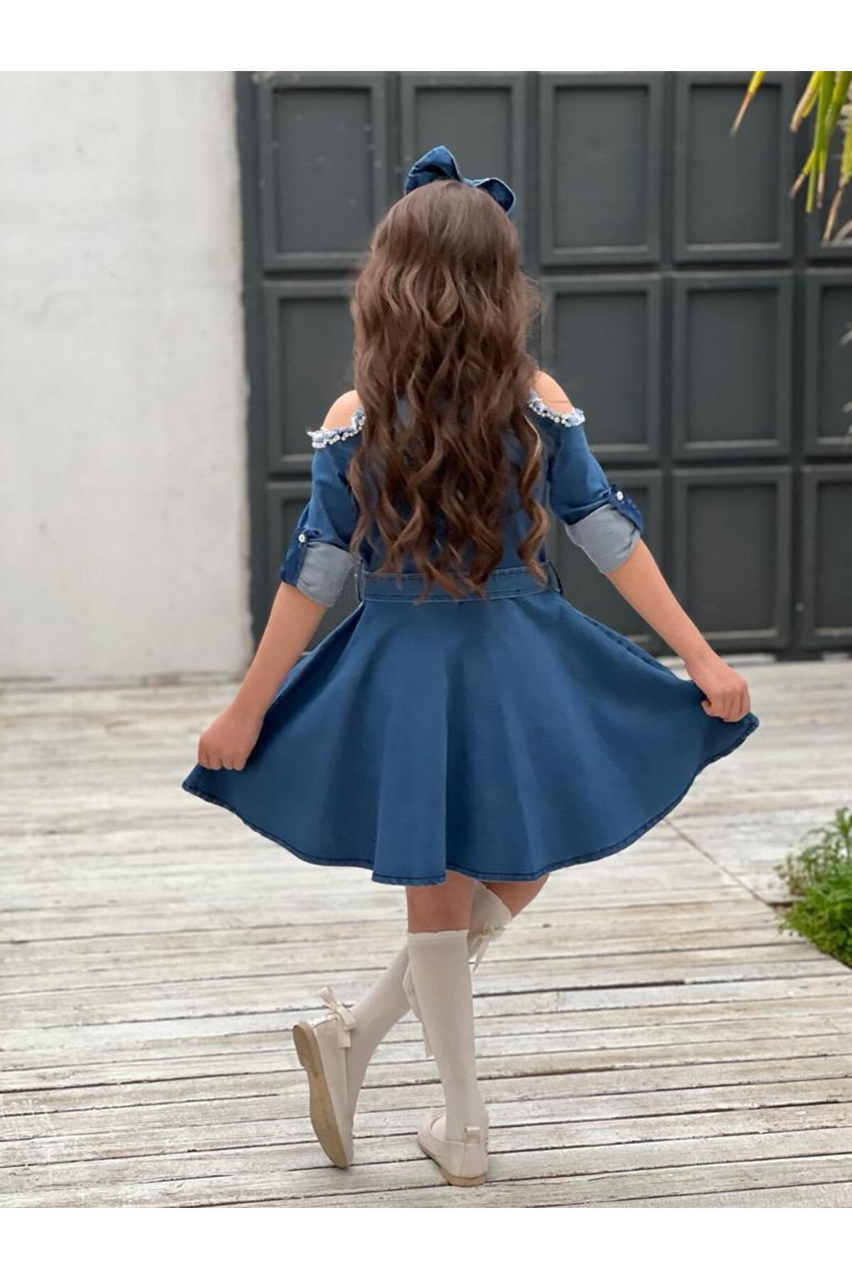 لباس 5 پارچه جین دخترانه منگوله دار سنگ شانه بچه گانه آستین بلند راسته دخترانه | Uğurböceği VLDOMZTSL040624
