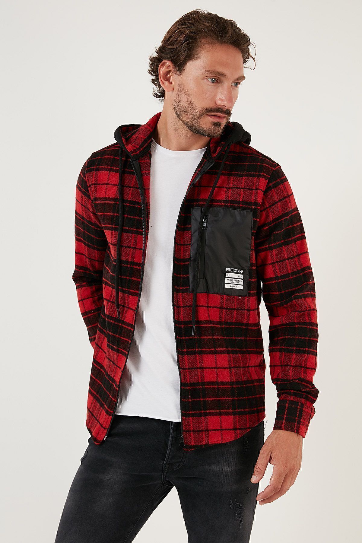 بوراتی پیراهن مردانه زمستانی بزرگ طرح چوب جنگلی، کلاه دار، زیپ دار، چهارخانه، CF24W197032