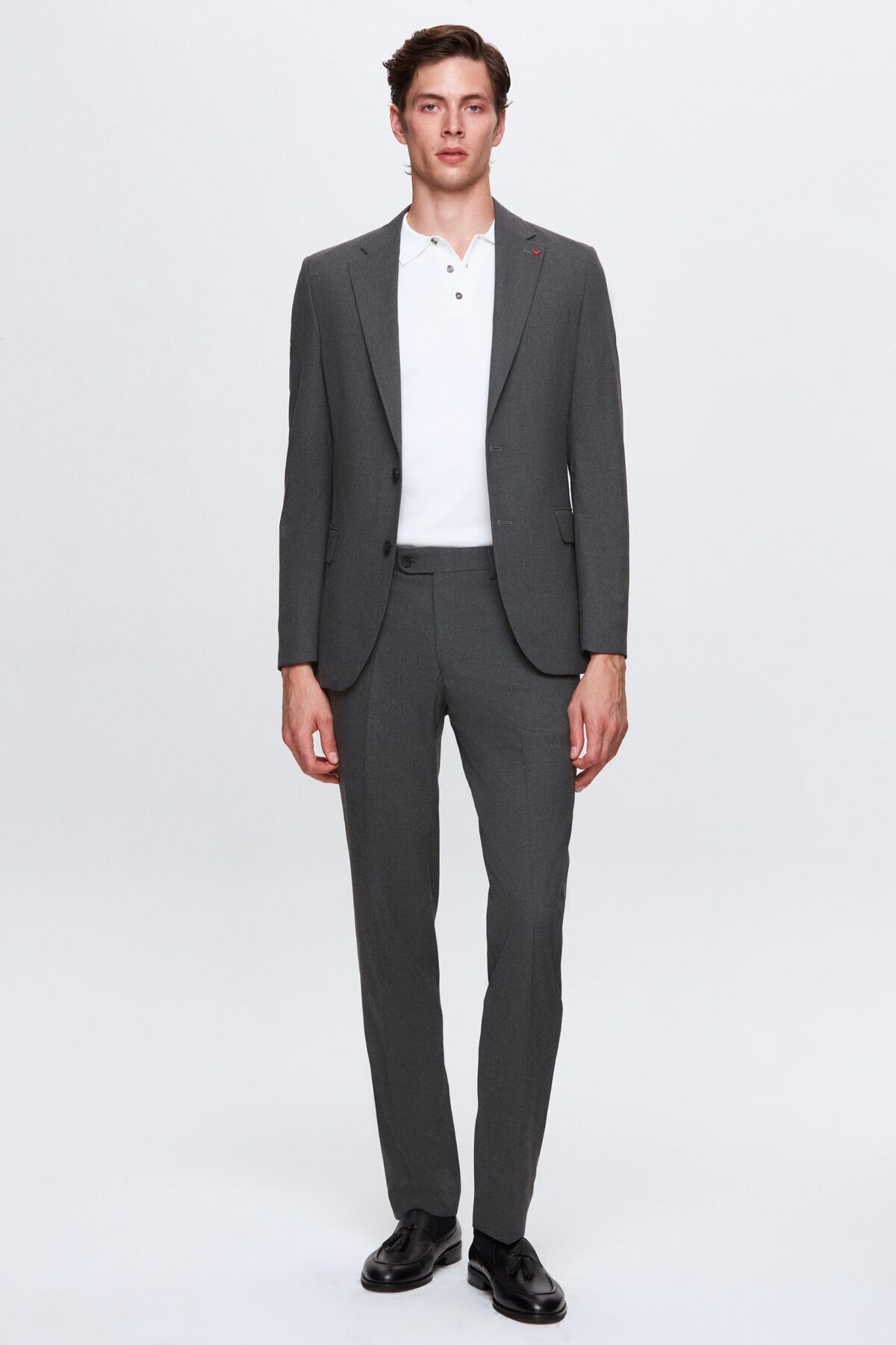 دی اس دامات کت و شلوار اسلیم فیت خاکستری ساده لیکرا، یقه مونو انعطاف‌پذیر، دو چاک آستردار، دی‌اس دامات