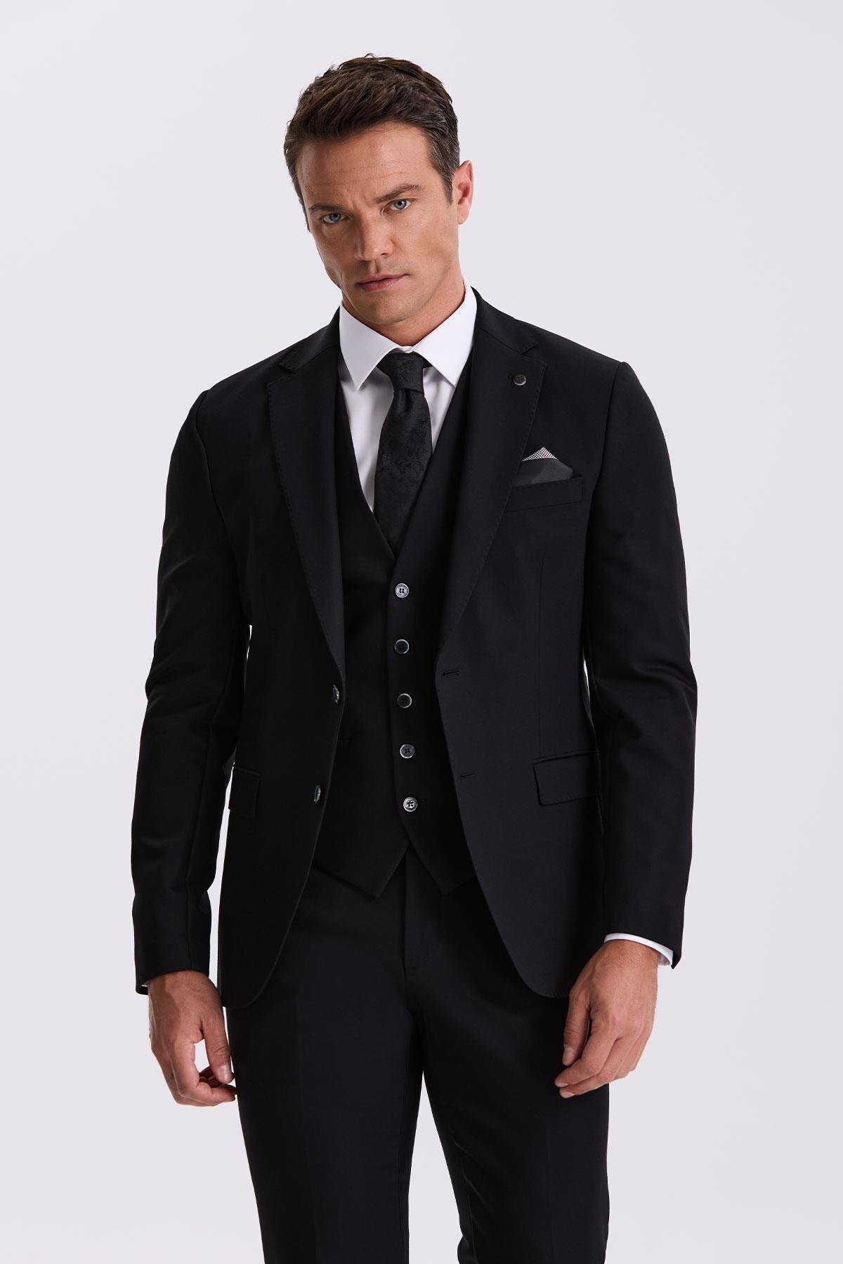 جاکامن کت و شلوار جلیقه دو چاک دار یقه تک باریک مشکی